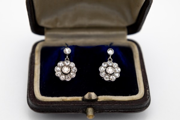 Ein Paar alte Ohrringe mit alten Diamanten im Brillantschliff und 8/8 mit einem Gesamtgewicht von ca. 1,30 ct. Ohrringe in Form von Blumen, ein beliebtes Motiv aus dem frühen 20. Jahrhundert.