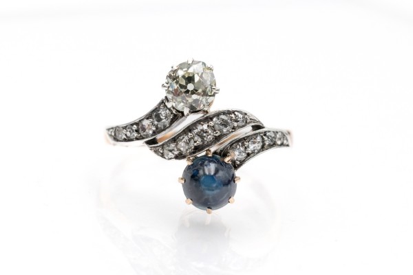 Seine edle Jugendstilform wird von einem „alten“ Brillanten von ca. 0,75 ct geziert. (Farbe M-N, Reinheit SI2). Auf der gegenüberliegenden Seite des Diamanten ist ein wunderschöner blauer Saphir im Cabochonschliff mit einem Gewicht von etwa 1,30 ct eingefasst.