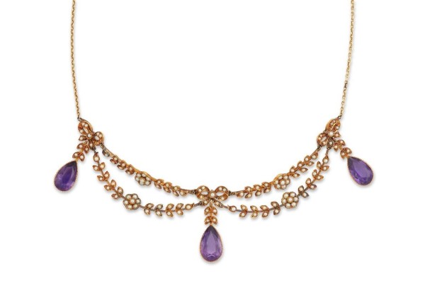 Eine Vintage-Goldkette (Feingold 585) aus dem frühen 20. Jahrhundert mit Amethysten und Perlen.