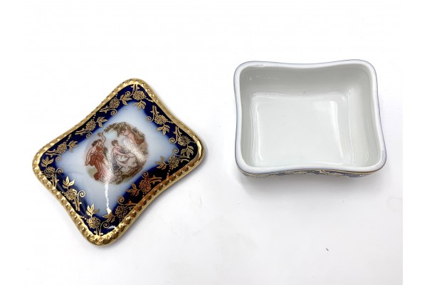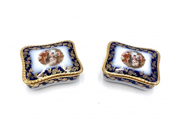 Zwei kleine Schatullen aus kobaltfarbenem Porzellan mit Genreszene.