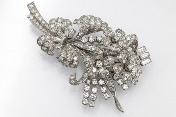 Die Brosche ist mit 181 Diamanten im Altschliff und 8/8-Brillanten mit einem Gesamtgewicht von ca. 9,00 ct (Farbe F-I, Reinheit VS-I1) besetzt.
