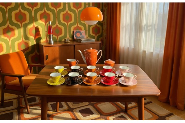 Das Service besteht aus: einer Kanne, einem Milchkännchen, einer Zuckerdose, 10 Tassen und 10 Untertassen.