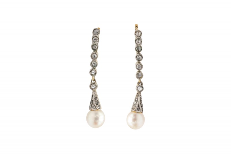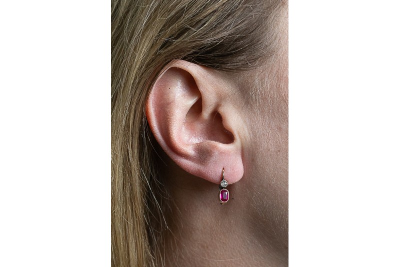 A pair of antique earrings made of 14-karat gold (585). Decorated with oval synthetic rubies and diamonds with a total weight of 0.16ct. Synthetic rubies were created at the end of the 19th century and became very popular in the early 20th century.