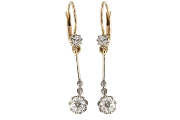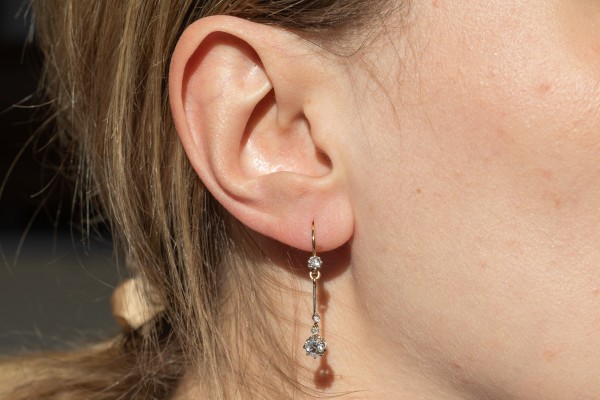 Old-cut diamond earrings crafted from 14-karat gold (0.585 fineness) and platinum. Classic dangle earrings set with four old-cut brilliant-cut diamonds and four 8/8 faceted diamonds, weighing approximately 0.83 ct (VS clarity, J color).