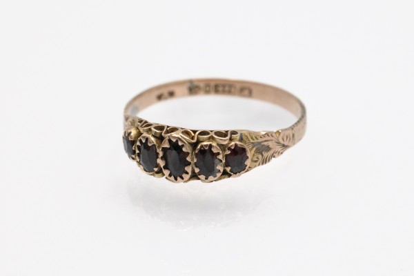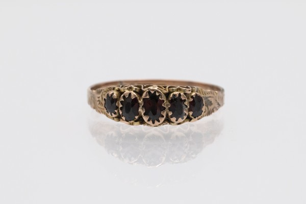 Crafted of 9-karat yellow gold (0.375 fineness) and set with five oval, faceted red garnets.