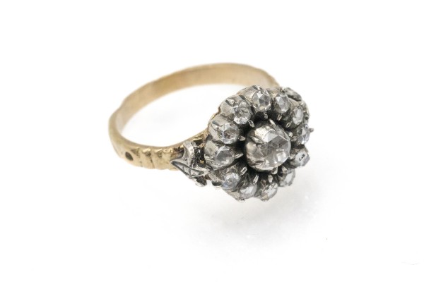 The central diamond measures approximately 3.87 mm in diameter, and the 12 surrounding diamonds measure approximately 1.80 mm in diameter. The diamonds are set on silver foil.