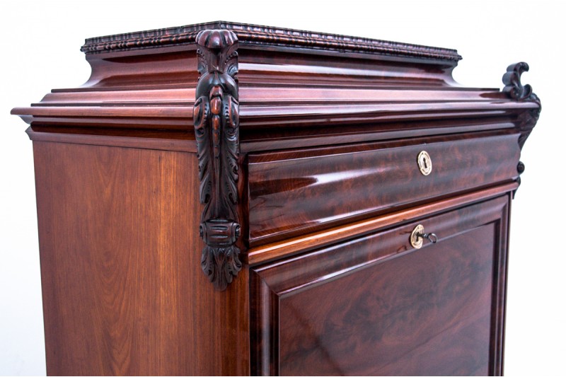 ANTIQUE-UNIQUE. Impressive secretary from the mid-19th century in Biedermeier style. Antique furniture with a more beautiful form will add elegance to any interior. A representative piece of furniture focused on functionality, it has a hinged hatch which, when opened, serves as a desk top, plus a lot of smaller and larger drawers. The middle ones are beautifully decorated with marquetry of the highest quality. Very good condition, after professional renovation.