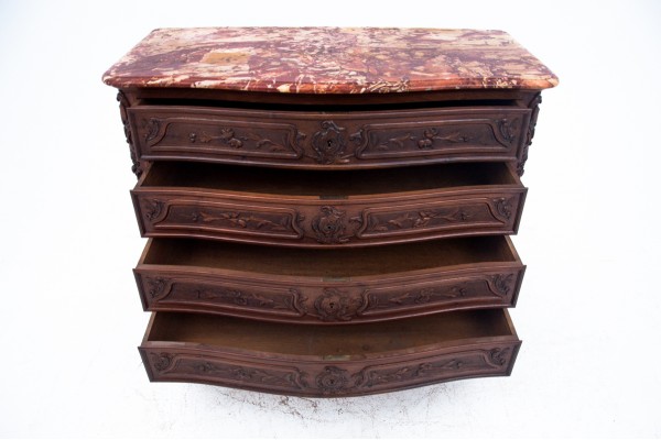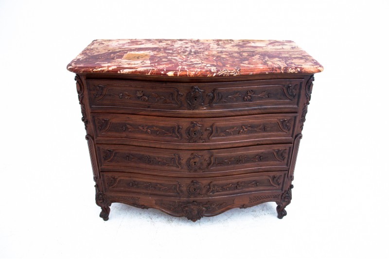 An antique chest of drawers with a stone top, circa 1890.