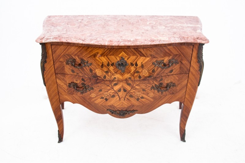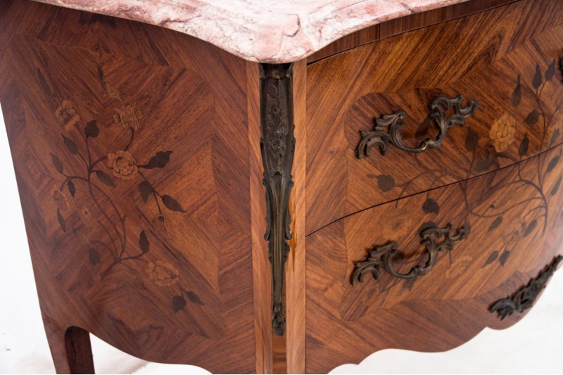 French chest of drawers with two drawers. Produced in France around 1880. made of walnut wood and marble top. Decorated with brass handles and floral inlay.