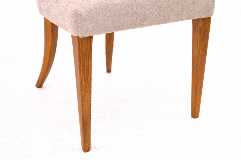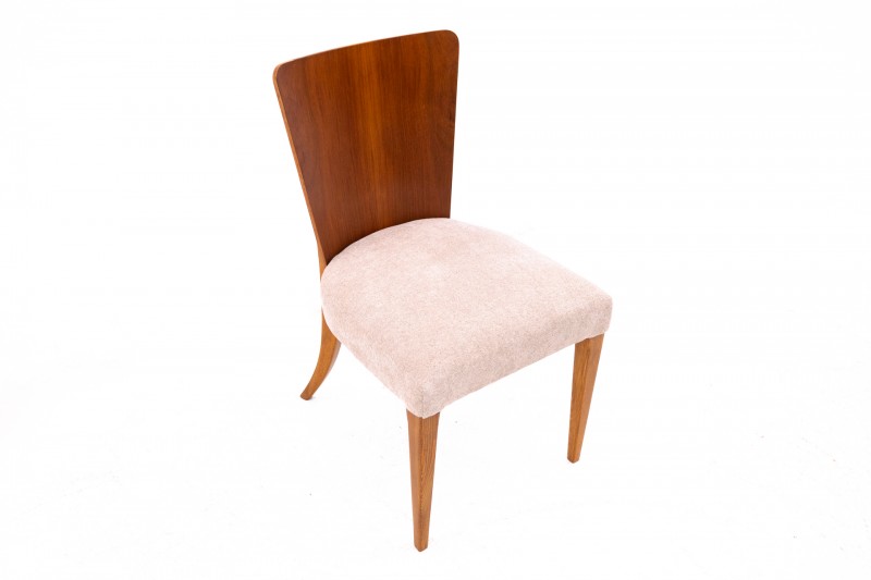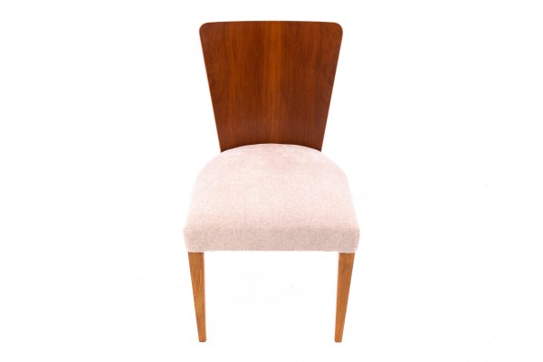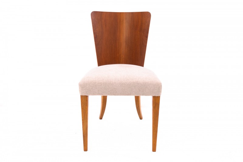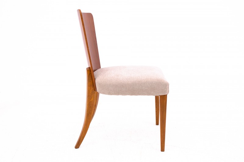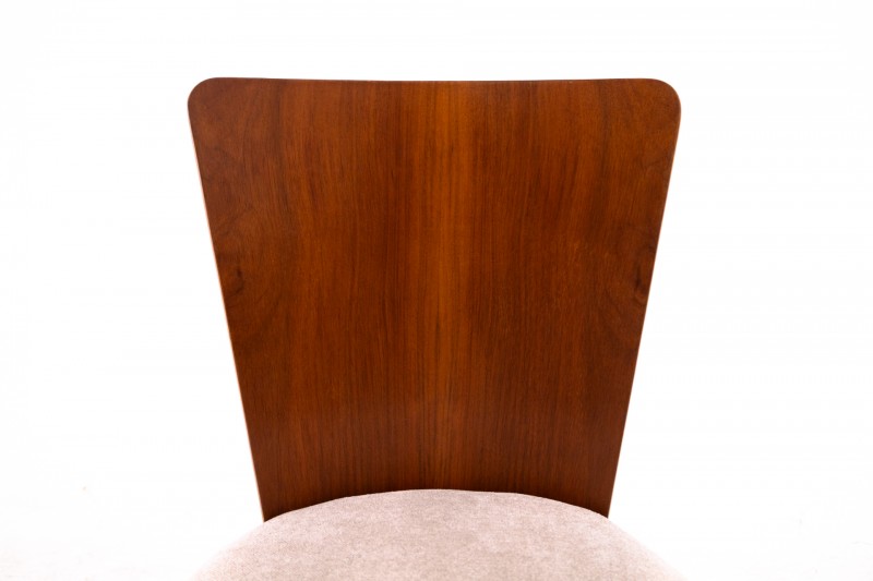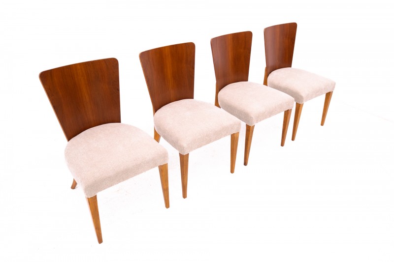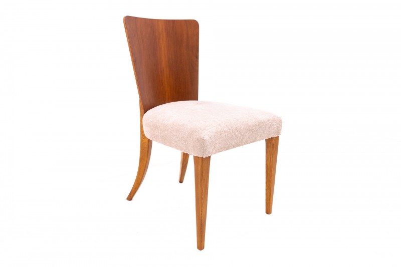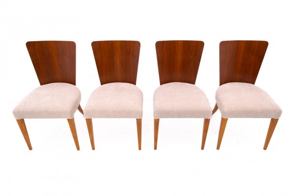 Four chairs model H-214 are a classic, timeless example of the Art Deco style. The chairs have curved back legs and a profiled backrest, which, combined with the upholstered seat, provide comfortable seating. Backrest veneered with walnut, legs made of beech.