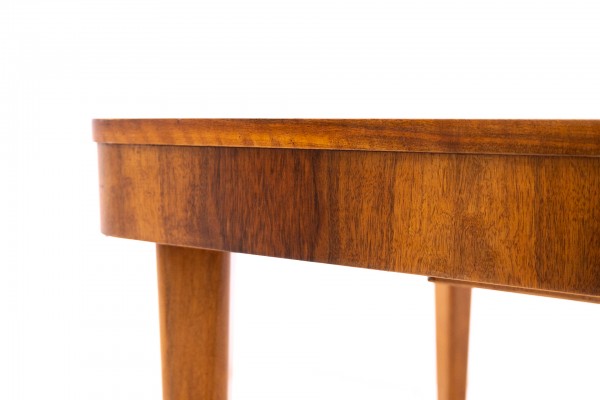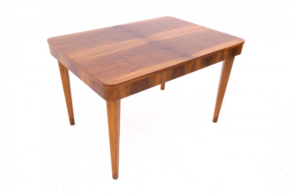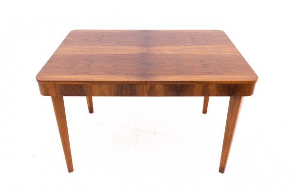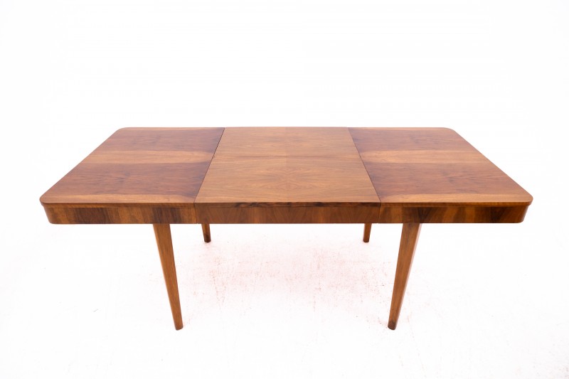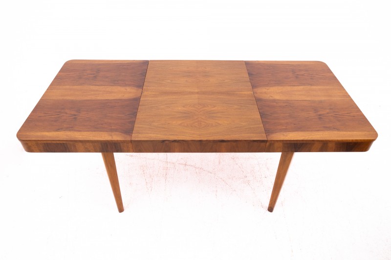 The table will work great even in small rooms. The original extension mechanism is fully functional. Top veneered with walnut wood, legs made of solid beech wood. A piece of furniture with a simple form that will be a great complement to modern interiors.