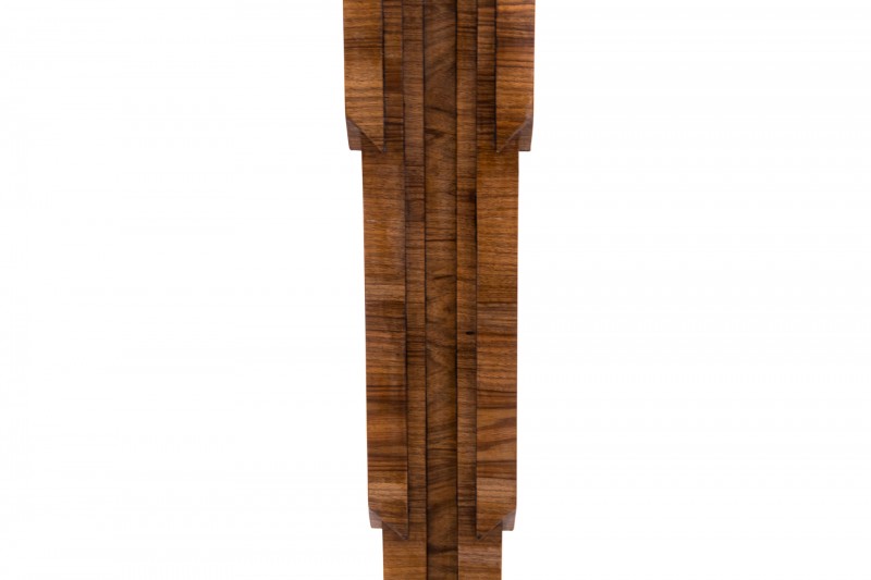 Drewniane podstawy lamp o geometrycznej formie, charakterystycznej dla stylu Art Deco. Lampa posiada dwa niewielkie, szklane klosze osadzone na wygiętych metalowych ramionach oraz miejsce na trzecią centralną żarówkę w czarnym, centralnym kloszu.