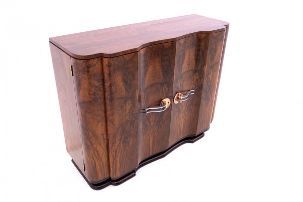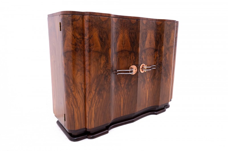 Komoda z jedną duża przestrzenia podzielona dwoma półkami. Drzwi zamykane na klucz. Komoda posiada piękną, falującą, geometryczną formę, charakterystyczną dla stylu Art Deco.