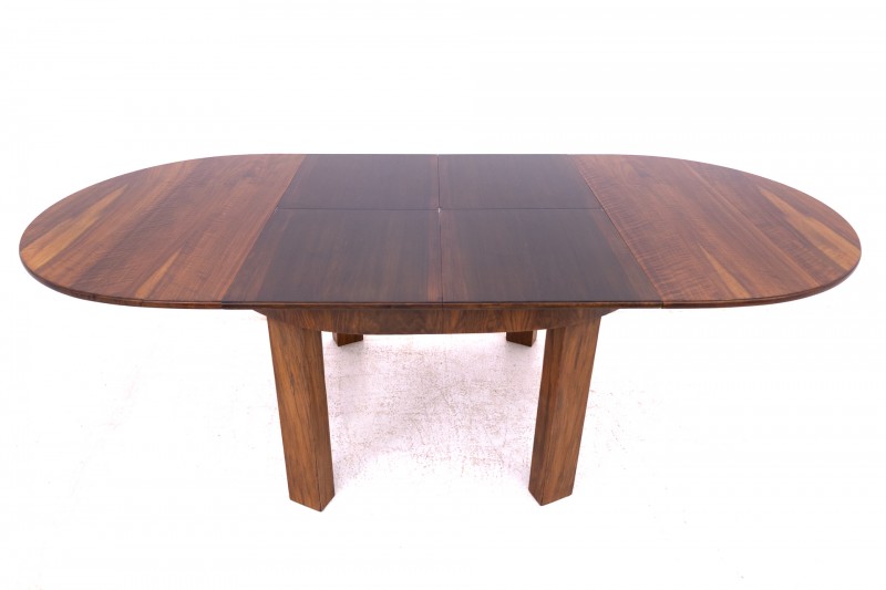 Stół o geometrycznej formie z masywnymi nogami oraz wyraźną, szeroką cargą. Forma charakterystyczna dla stylu Art Deco. Stół fornirowany drewnem orzechowym. Posiada wkładkę, która pozwala na rozłożenie stołu do większych rozmiarów.