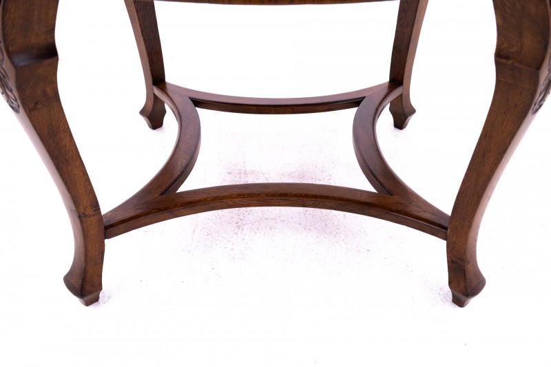 Meble w bardzo dobrym stanie, po profesjonalnej renowacji. Siedziska krzeseł zostały obite nową skórą naturalną.