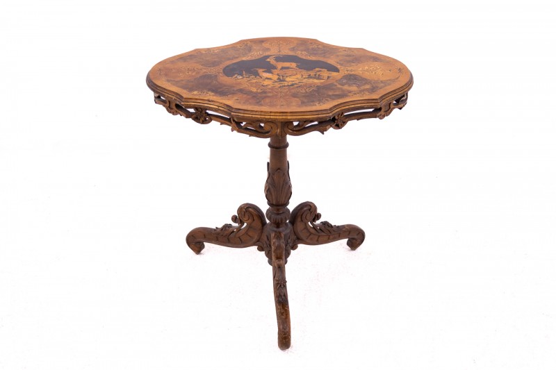 Nietuzinkowy stolik z piękna intarsją, Francja, ok. 1880 rok.