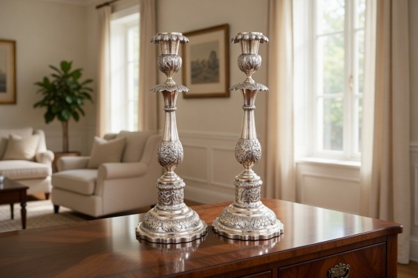 Para srebrbnych świeczników, Francja, rok około 1860.