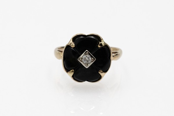 Złoty pierścionek z brylantem i onyksem w szlifie fantazyjnym