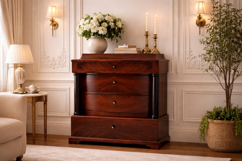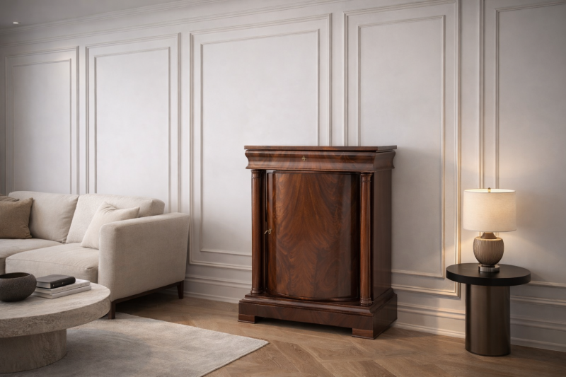 Antyczna komoda rogowa z połowy XIX wieku w stylu biedermeier.