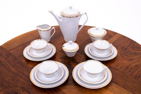 Elegancki serwis kawowy z polskiej fabryki porcelany Chodzież. Biała porcelana ze złotymi elementami z lat 80 XX wieku.